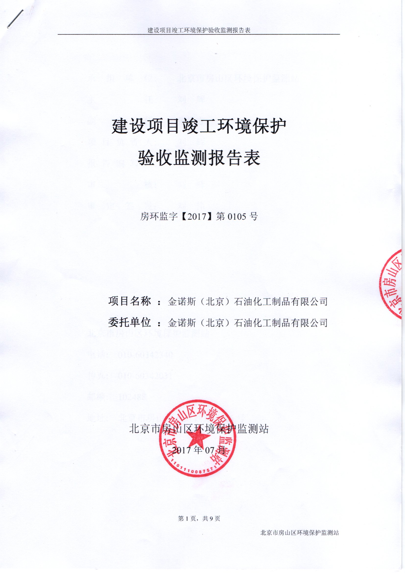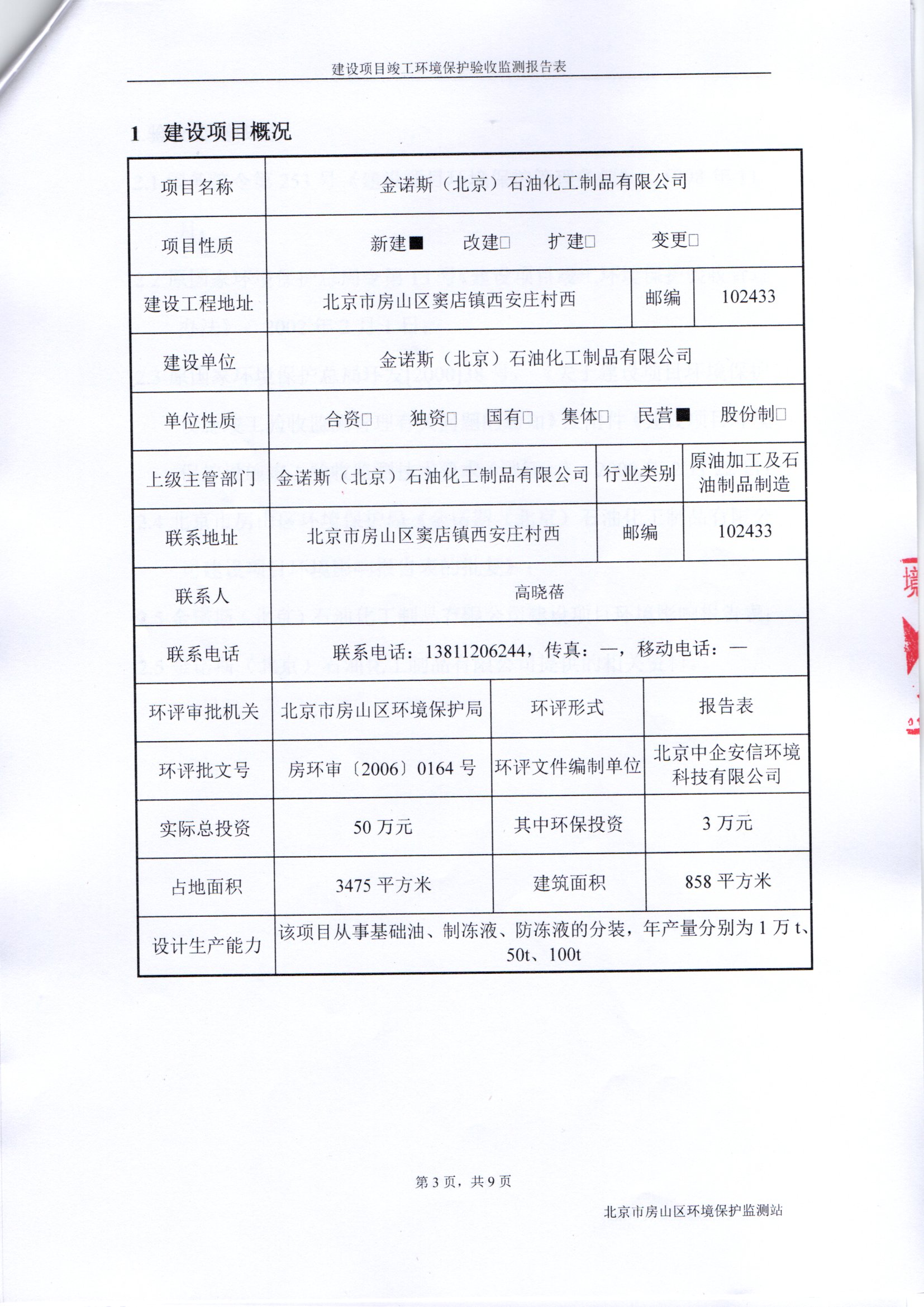 公示一:金诺斯(北京)石油化工制品有限公司分装润滑油、制动液、防冻液项目竣工验收